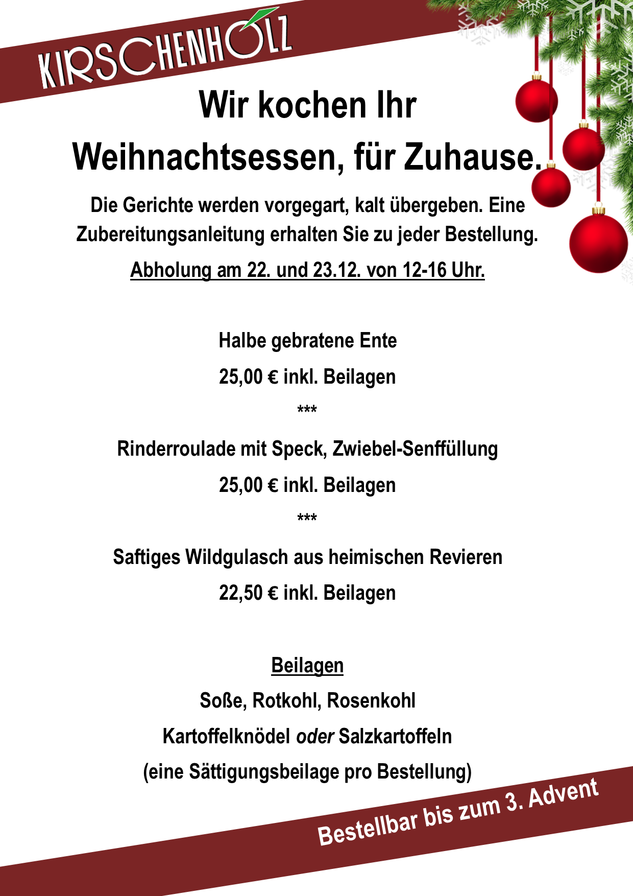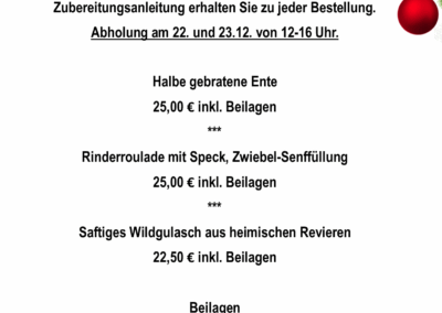 Wir bereiten Ihr Festessen für Zuhause vor – z. B. ½ gebratene Ente oder Rinderroulade. Sie holen das Menü ab, erhalten eine Anleitung und bereiten es ganz einfach daheim fertig.