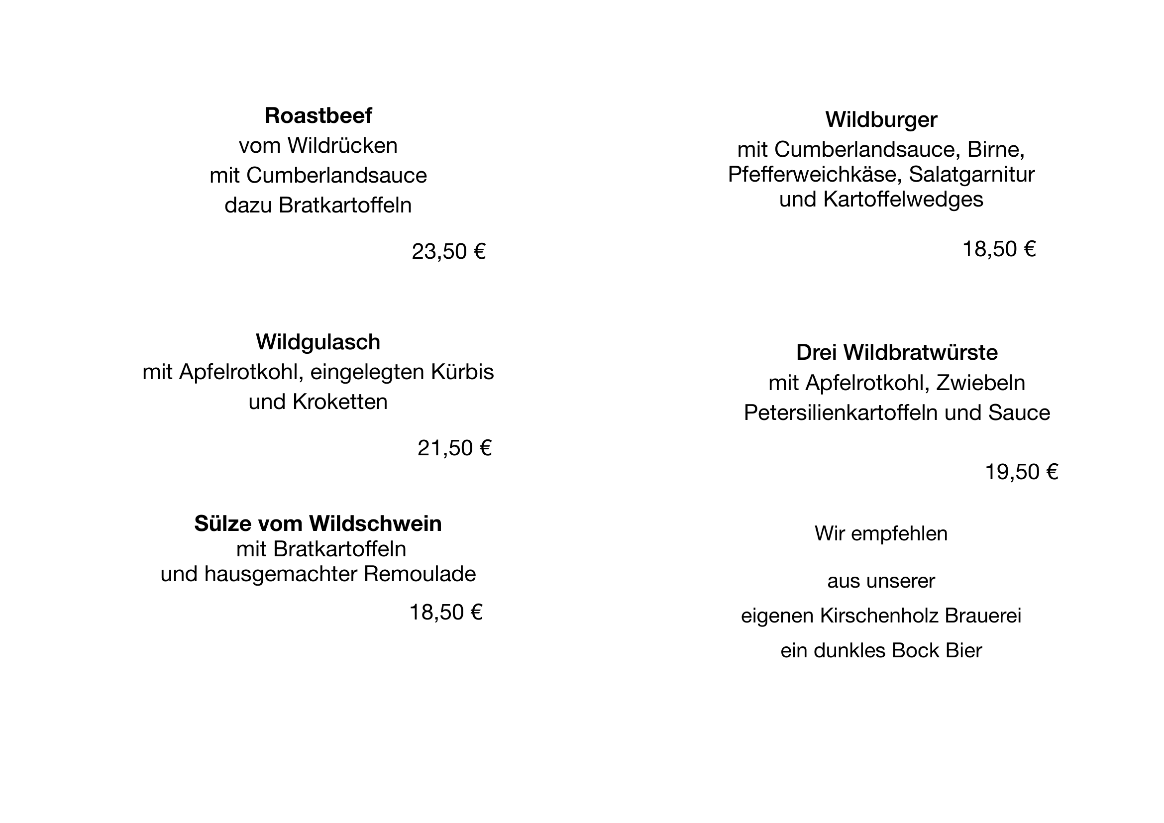 An allen Öffnungstagen können Sie aus unserer Spezialitätenkarte einzigartige Wildgerichte aus heimischen Revieren auswählen.